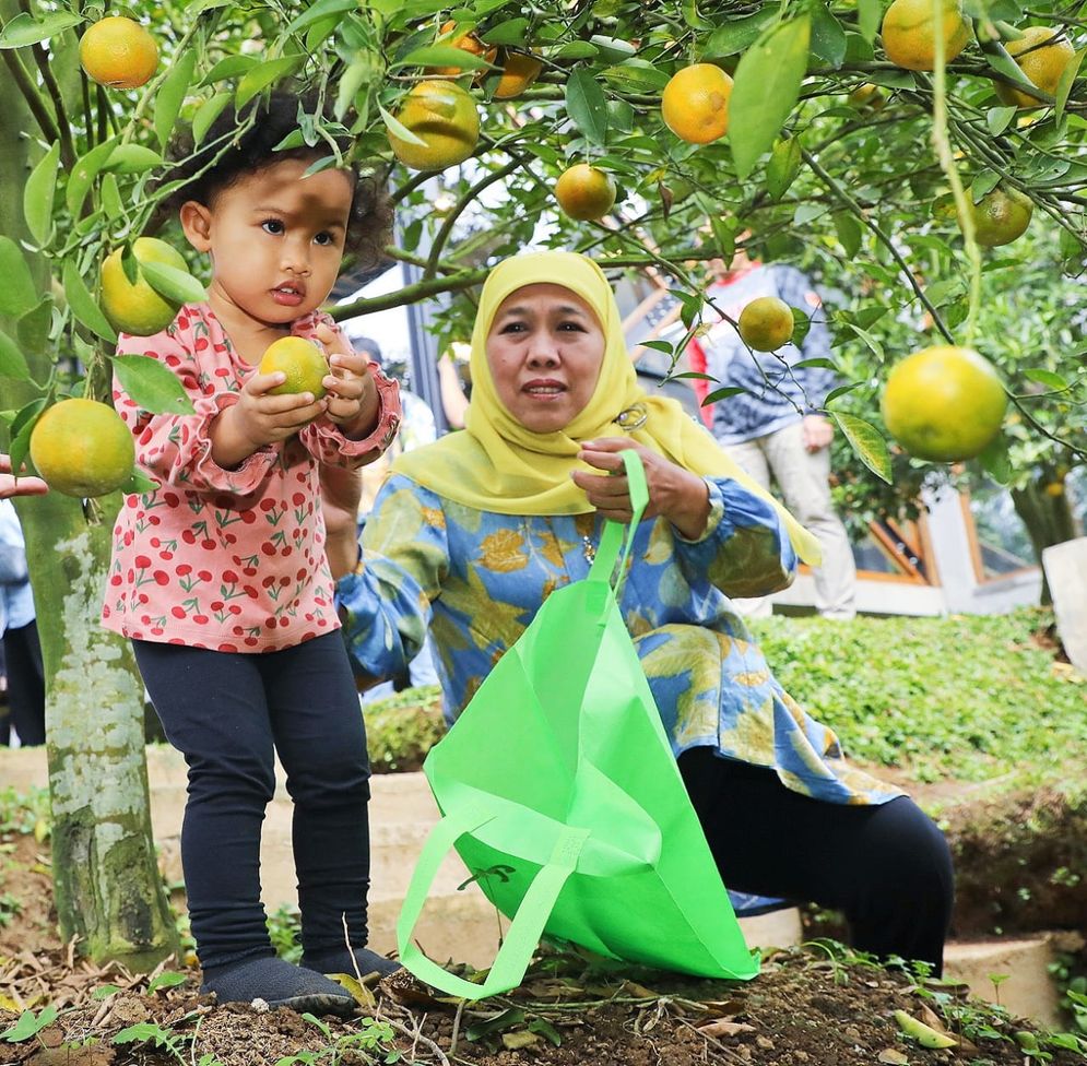 Masih di Kota Batu, rombongan Gubernur Khofifah juga berwisata petik jeruk 55. Tak ingin ketinggalan, si kecil Aila juga ikut memetik sendiri jeruk yang sudah masak di lahan seluas 2 hektar tersebut.. (*)
