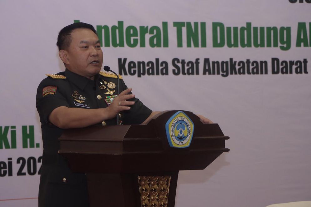 SURABAYA | halojatim.com - Kepala Staf Angkatan Darat (KSAD) Jenderal TNI Dudung Abdurachman memberi kuliah umum bela negara di Universitas Dr Soetomo (Unitomo) Surabaya, Sabtu (21/5/2022).