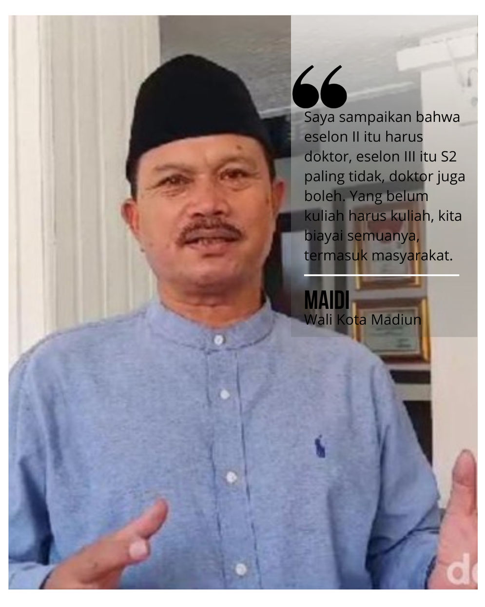 "Saya sampaikan bahwa eselon II itu harus doktor, eselon III itu S2 paling tidak, doktor juga boleh. Yang belum kuliah harus kuliah, kita biayai semuanya, termasuk masyarakat," kata Wali Kota Madiun Maidi.